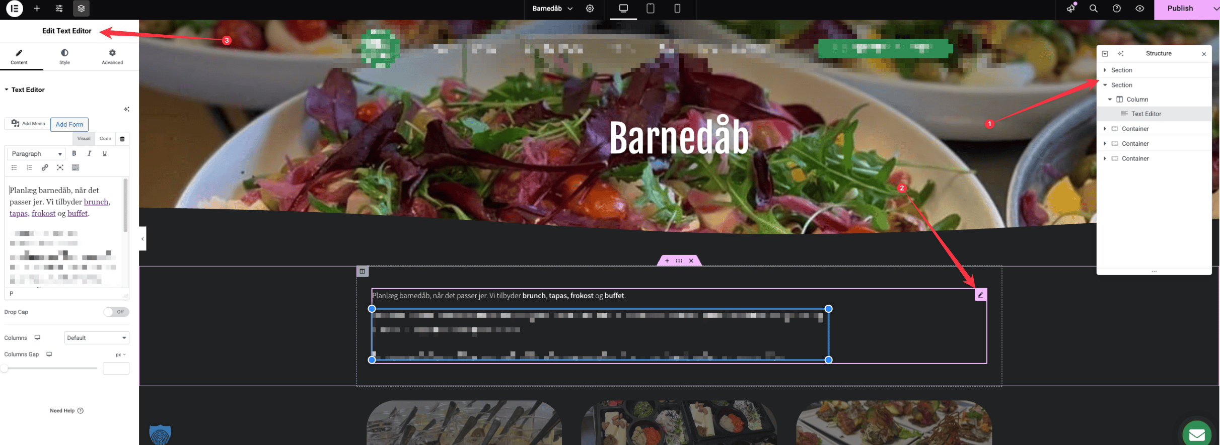 - I højre side har du "Struktur" listen af elementer på hele siden. Her kan du se alle elementer opsat på den side du redigere.