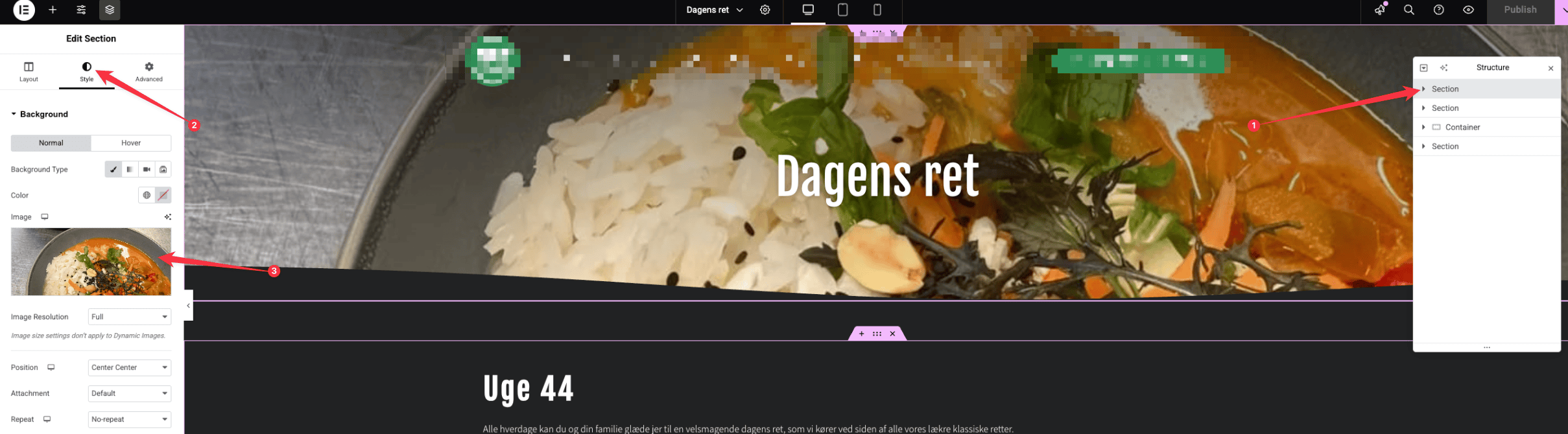 - I højre side i din "Structure" liste kan du trykke på den sektion/container du ønsker at skifte billedet på (se pil 1). Så skal du i venstre side af skærmen skifte til "Style/stil" og herunder "image" kan du skifte billedet på din underside.