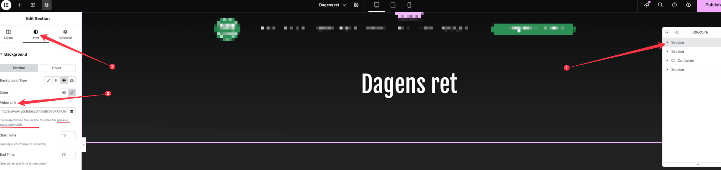 - Tryk på det ønskede element og i venstre side tryk "style/stil" og vælg "video" i "background type".