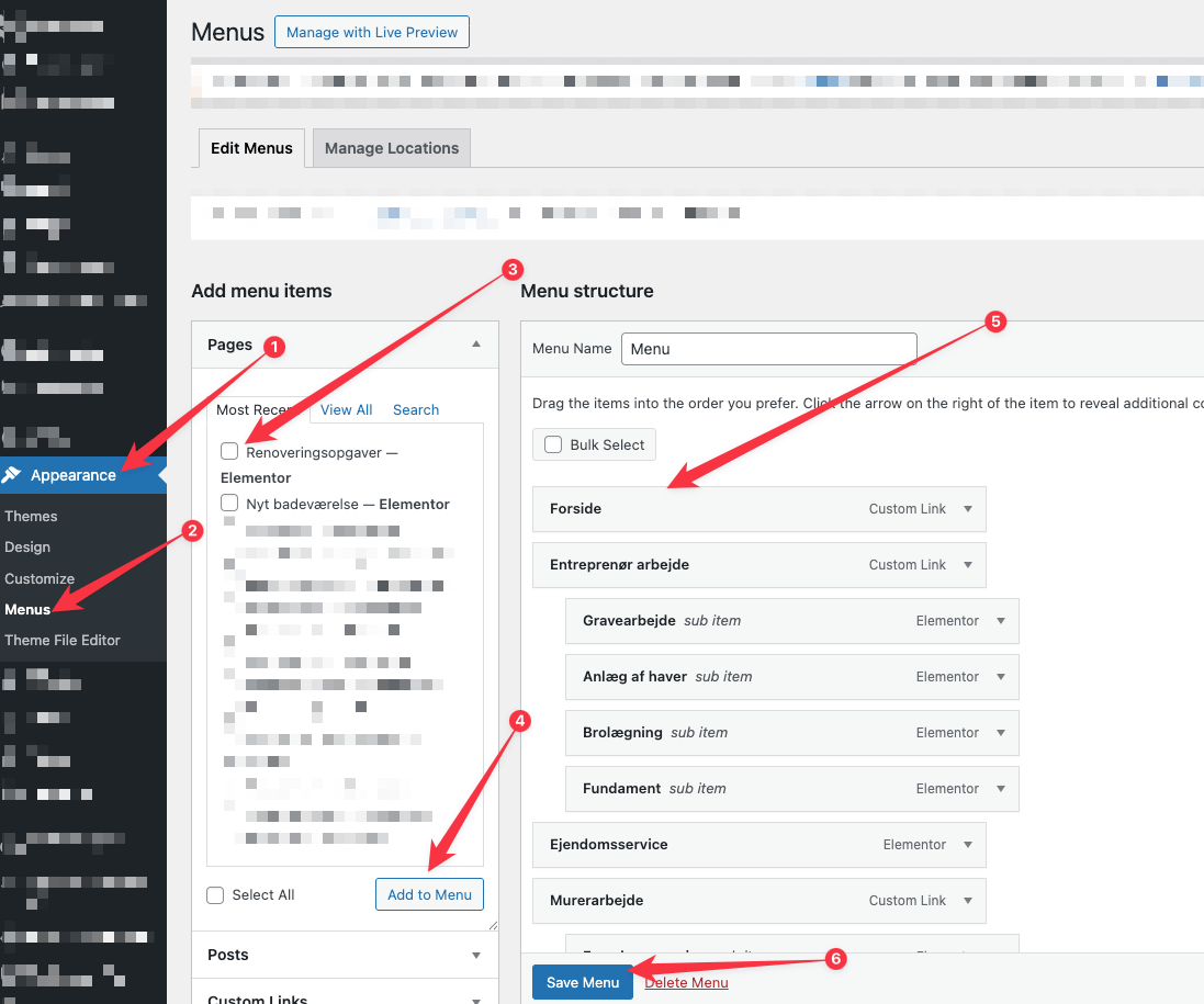 - Nu er du inde i selve menu strukturen, hvor du kan bygge din egen WordPress menu.