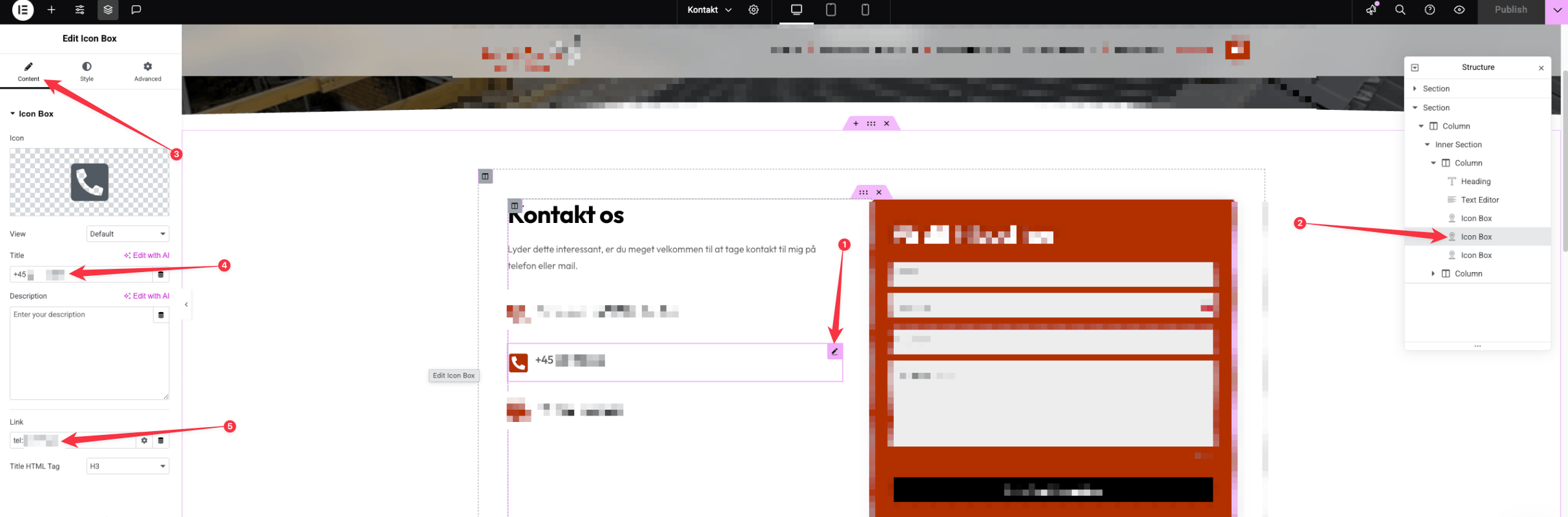 - Når man har trykket på elementet man ønsker at rette til, så åbner der sig en "Editor" menu over i venstre side af skærmen. Her kan du ændre dit telefon nummer ved at trykke på content i venstre hjørne (pil 3)