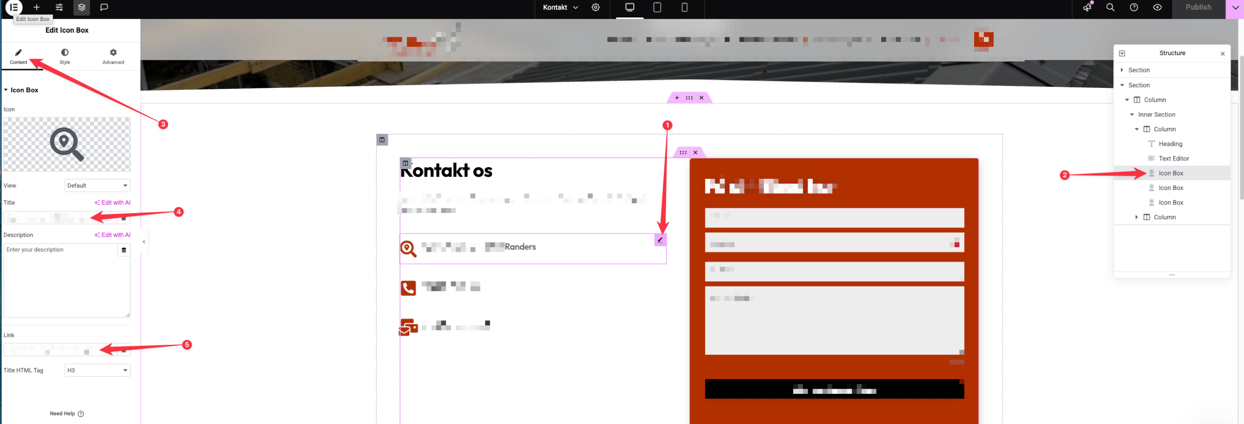 - Når man har trykket på elementet man ønsker at rette til, så åbner der sig en "Editor" menu over i venstre side af skærmen. Her kan du ændre din adresse (se pil 4) og linket til Google Maps (pil 5)
