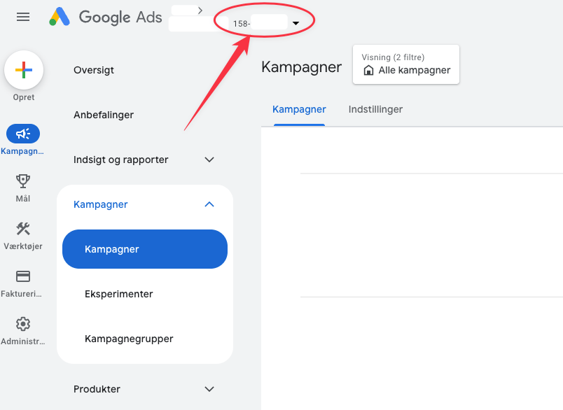 Find dit 10 cifret Google Ads ID i enten venstre eller højre hjørne (format: 123-456-7890) og send det 10 cifret Google Ads ID til os.