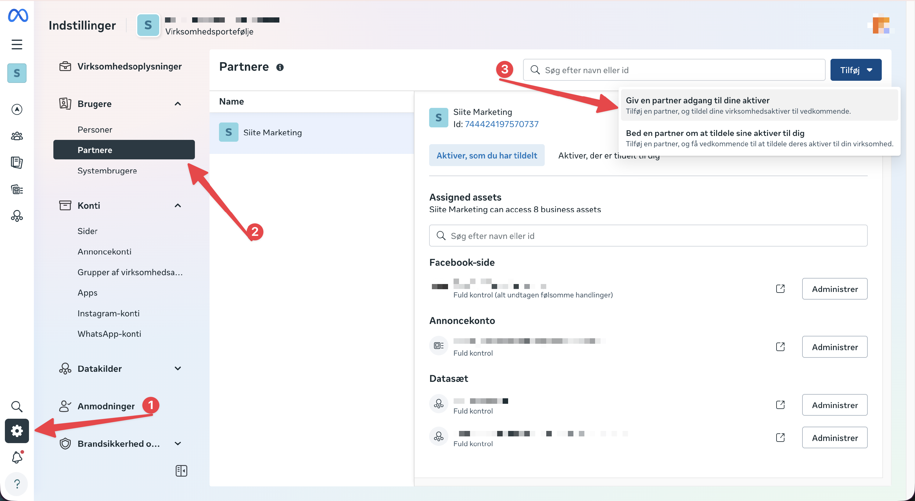Denne guide viser trin for trin, hvordan du giver Siite adgang til din Meta Business Suite/Business Manager. Du kan enten invitere os som person (anbefalet) med e-mailen kontakt@siite.dk og give os fuld adgang, eller du kan give adgang via vores partner-ID: 744424197570737. Vi anbefaler, at du inviterer os som person, da vi dermed selv kan opsætte annoncekonto, pixel, katalog m.m., hvis det mangler.