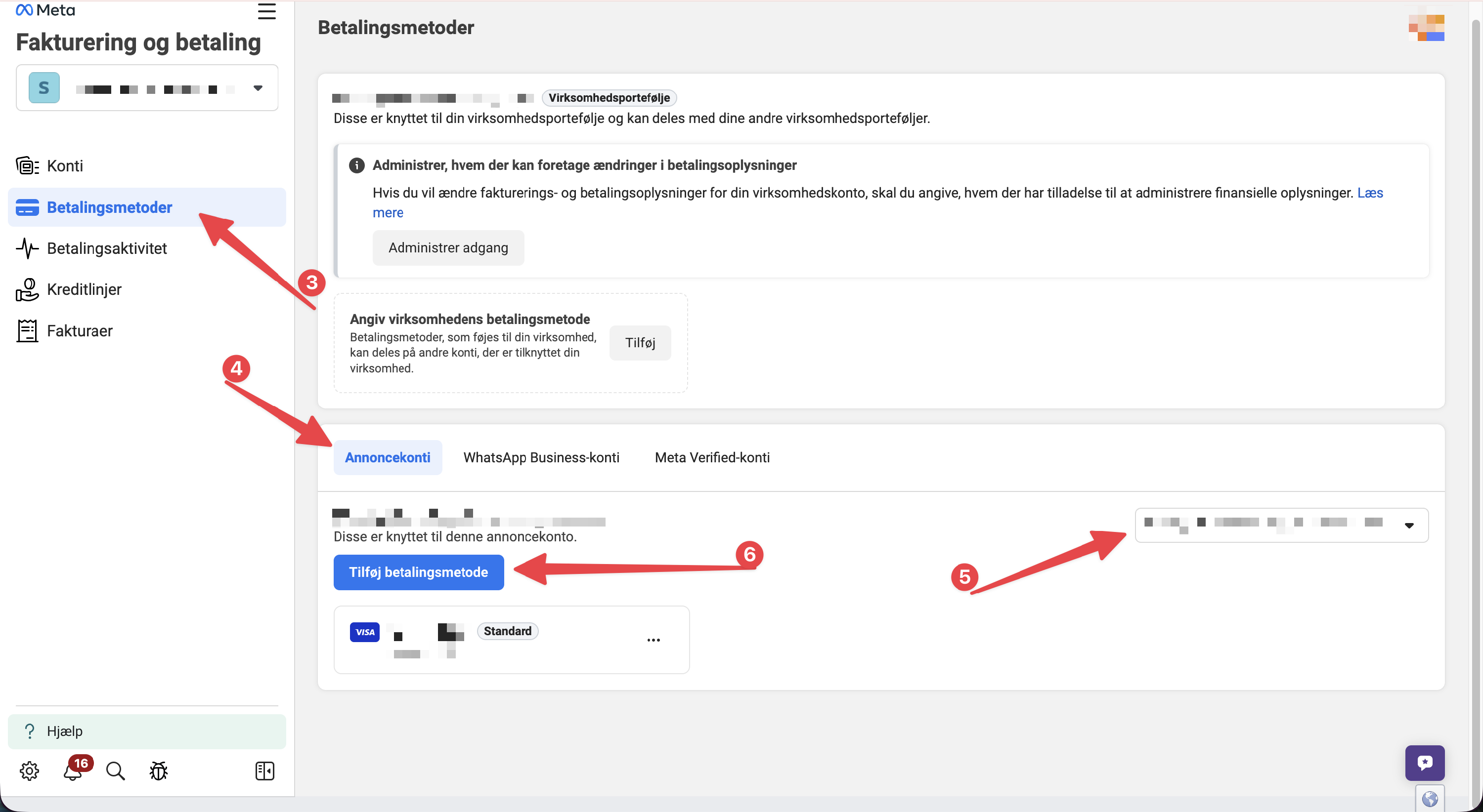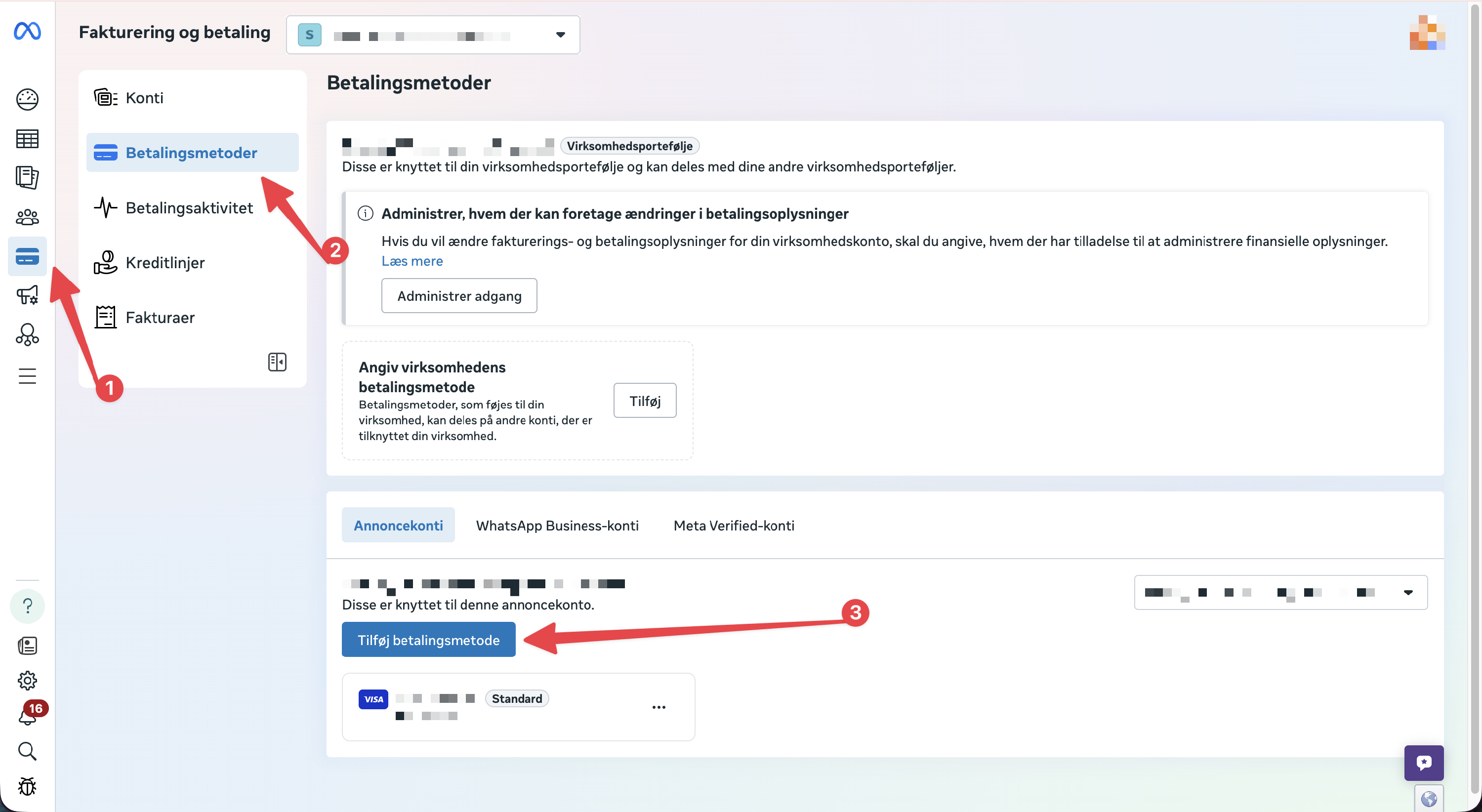 - Klik Betalingsmetoder > Annoncekonti > Vælg annoncekonto