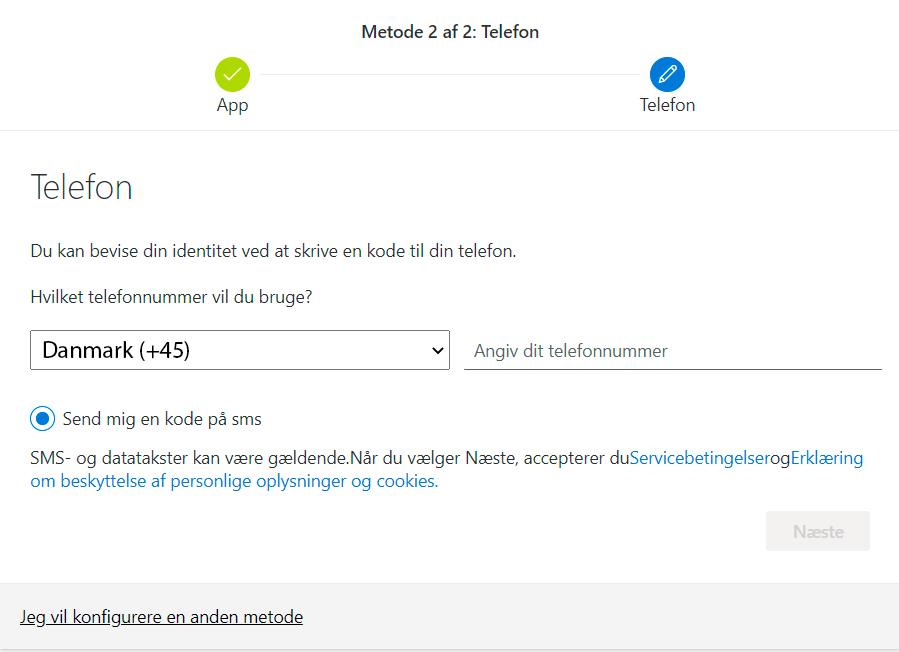 - Vælg “Send mig en kode på SMS” og tryk “Næste”.