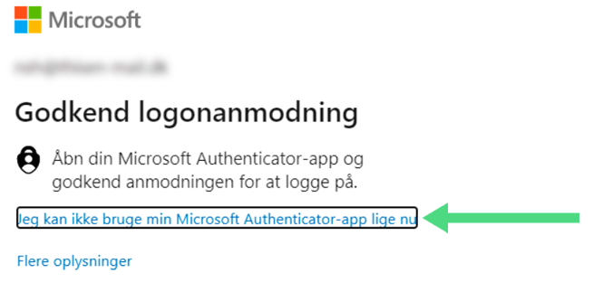- Trykke på “Jeg kan ikke bruge min Authenticator-app lige nu”.